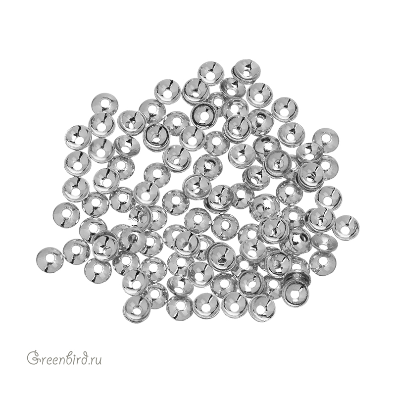 Фурнитура для бижутерии - шапочка для бус и шнуров гладкая. Материал: латунь, покрытие: родий. Диаметр: 3,0-3,08 мм, высота: 0,95 мм, отверстие: 0,8 мм. Производство: Китай. Цена указана за упаковку (примерно 100 штук).