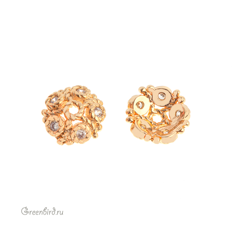 Фурнитура для бижутерии - ажурная шапочка для бус и шнуров с фианитами. Материал: латунь, покрытие: родий. Размер: 7,8 х 2,7 мм, максимальный внутренний диаметр: 6,2 мм, диаметр отверстия: 0,8 мм. Производство: Китай. Цена указана за 1 шт.
