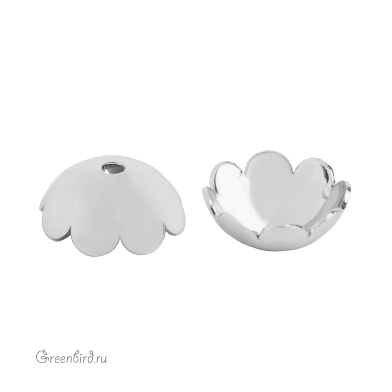 Фурнитура для бижутерии - шапочка для бус и шнуров гладкая с фигурным краем. Материал: латунь, покрытие: родий. Размер: 7,7 х 3,1 мм, максимальный внутренний диаметр: 6,9 мм, диаметр отверстия: 1 мм. Производство: Китай. Цена указана за 1 шт.