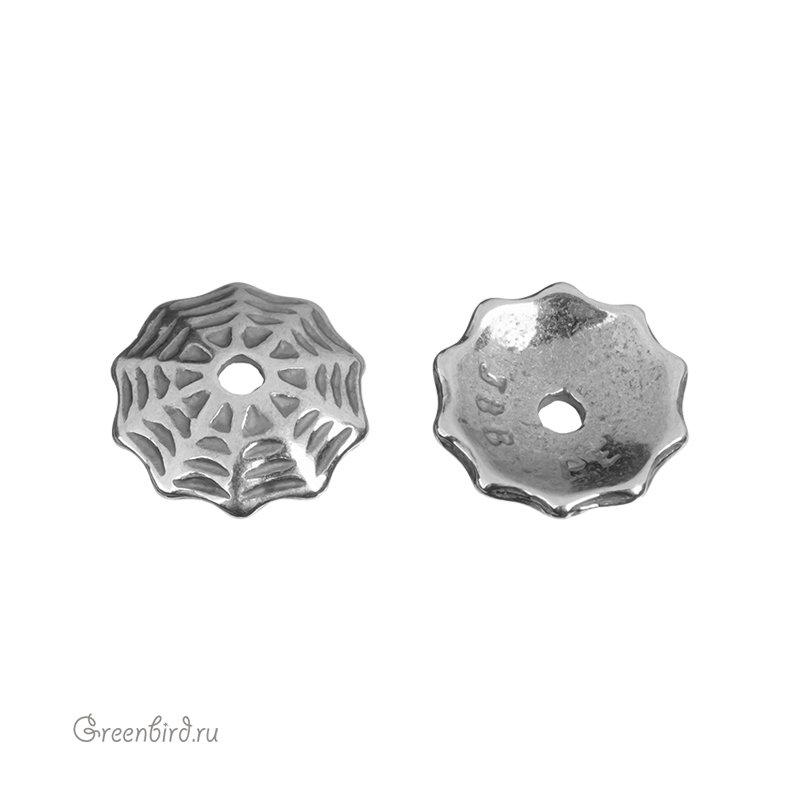 Чашечка для бусины сплошная с узором в виде паутины. Материал: латунь, цвет: античное серебро. Размер: 7,8 х 8 х 1,9 мм, отверстие: 0,95-1,10 мм. Производство: Израиль. Цена указана за 1 шт.