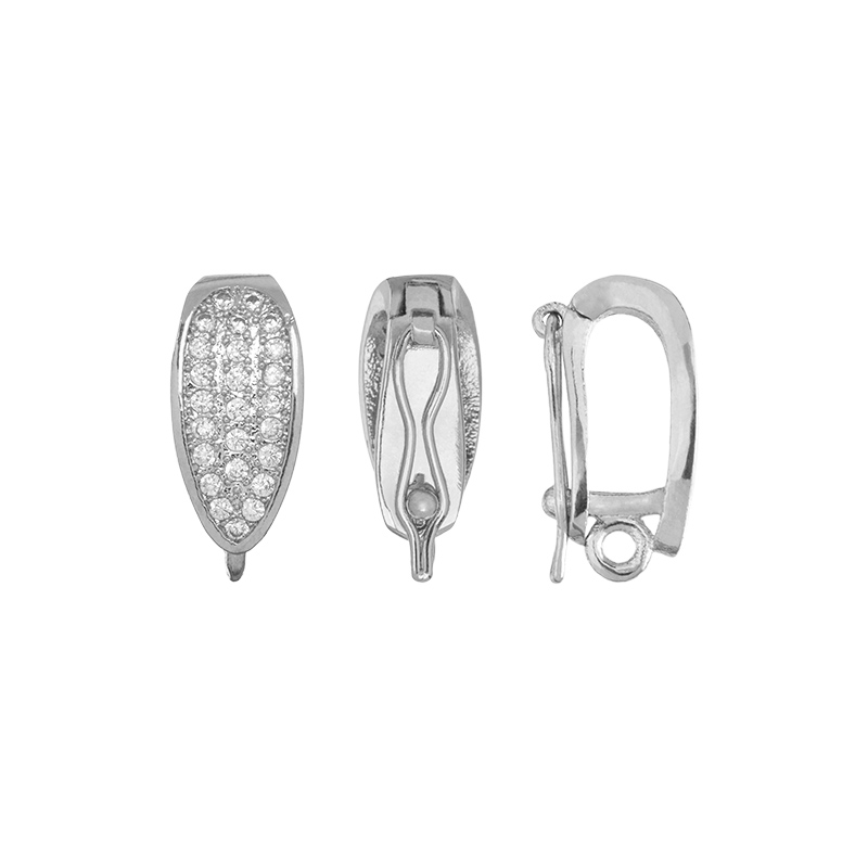 Фурнитура для бижутерии - бейл-замочек (разъемный бейл с застежкой по типу часового замка) с фианитами. Материал: латунь, покрытие: родий. Размер с колечком: 6 х 14 мм, внутренний размер: 4 х 8 мм, внутренний размер колечка: 1,3 мм. Производство: Китай. Цена указана за 1 шт.