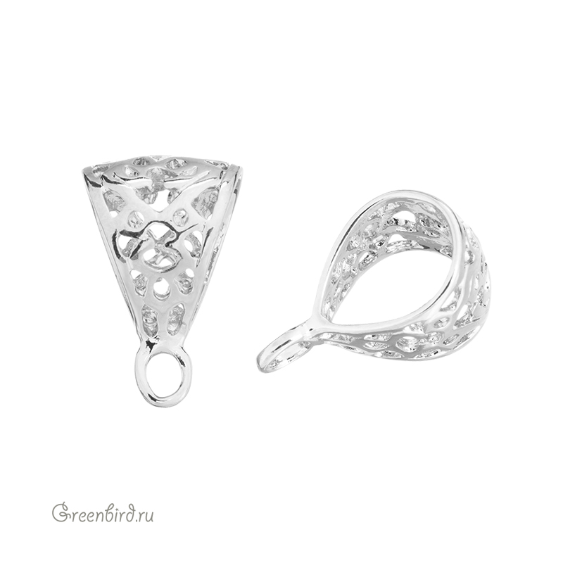 Фурнитура для бижутерии - классический объемный коннектор-бейл с ажурным узором, с запаянным колечком. Подходит для объемных шнуров и небольших жгутов. Материал: латунь, покрытие: родий. Размер с колечком: 10,8 х 17 мм, отверстие: 7,6 х 9,7 мм, внутренний диаметр колечка: 2,4 мм. Производство: Китай. Цена указана за 1 шт.