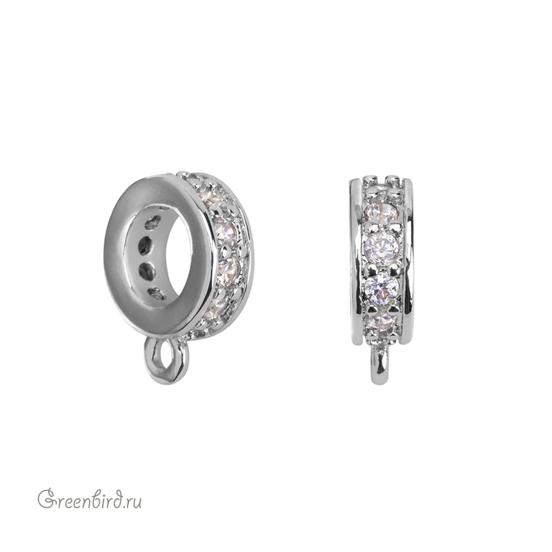 Фурнитура для бижутерии - коннектор-бейл в форме рондели с фианитами. Материал: латунь, покрытие: родий. Размер декоративного элемента: 2,8 х 7,3 мм, высота с колечком: 9,4 мм, внутренний диаметр рондели: 4,3 мм, внутренний размер колечка: 1,1 мм. Производство: Китай. Цена указана за 1 шт.