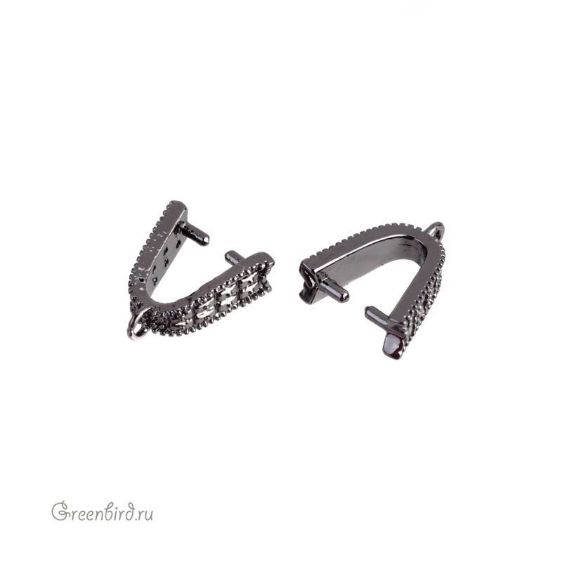 Фурнитура для бижутерии - бейл-зажим, с одной стороны украшенный фианитами. Материал: латунь, покрытие: gunmetal (оружейная сталь). Размер с колечком: 3,6 х 10,4 х 9,2 мм, внутренний размер колечка: 1,4 мм, штырьки: 1 х 2,1 мм. Производство: Китай. Цена указана за 1 шт.