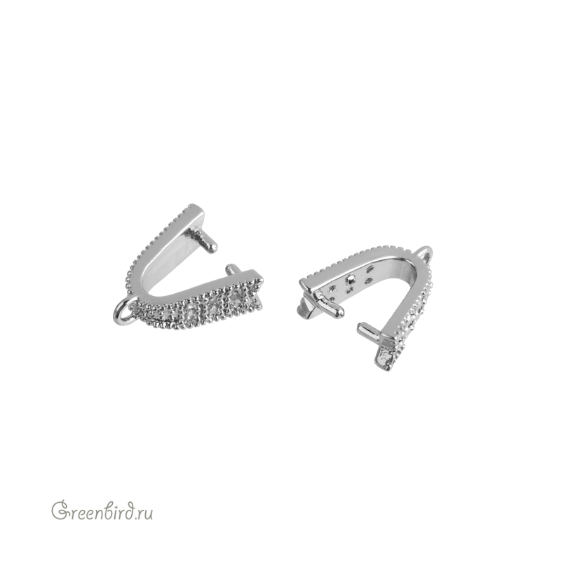 Фурнитура для бижутерии - бейл-зажим, с одной стороны украшенный фианитами. Материал: латунь, покрытие: родий. Размер с колечком: 3,6 х 10,4 х 9,2 мм, внутренний размер колечка: 1,4 мм, штырьки: 1 х 2,1 мм. Производство: Китай. Цена указана за 1 шт.