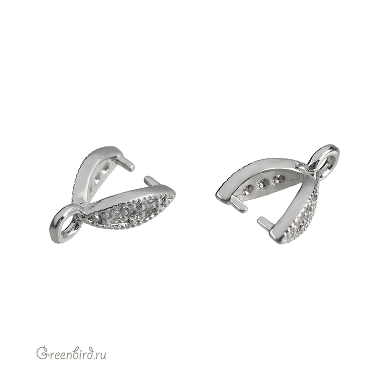 Фурнитура для бижутерии - бейл-зажим, украшенный фианитами. Материал: латунь, покрытие: родий. Размер зажима: 3,3 х 6,7 х 7,3 мм, высота с колечком: 9,3 мм, внутренний размер колечка: 1,4 мм, толщина штырьков: 0,75 мм. Производство: Китай. Цена указана за 1 шт.