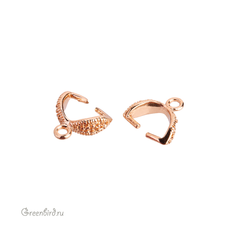 Фурнитура для бижутерии - бейл-зажим. Материал: латунь, покрытие: красное золото. Размер зажима: 3,2 х 8,8 х 7,1 мм, высота с колечком: 9,6 мм, внутренний размер колечка: 1,4 мм, толщина штырьков: 0,9 мм. Производство: Китай. Цена указана за 1 шт.