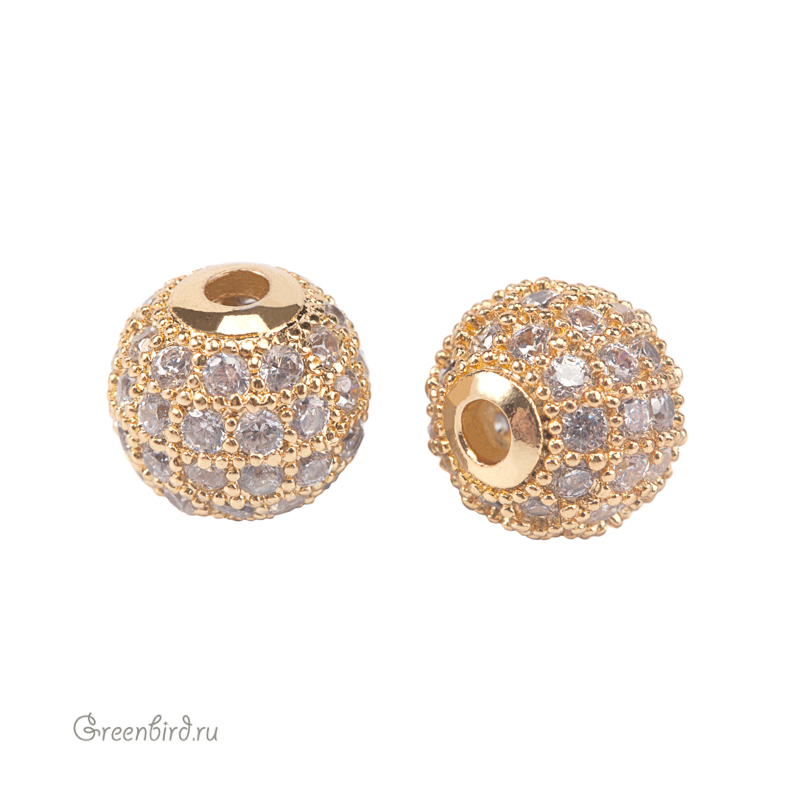 Металлическая бусина в форме шара с фианитами. Материал: латунь, покрытие: золото. Размер: 8 х 8,4 мм, диаметр отверстия: 1,9 мм. Производство: Китай. Цена указана за 1 шт.