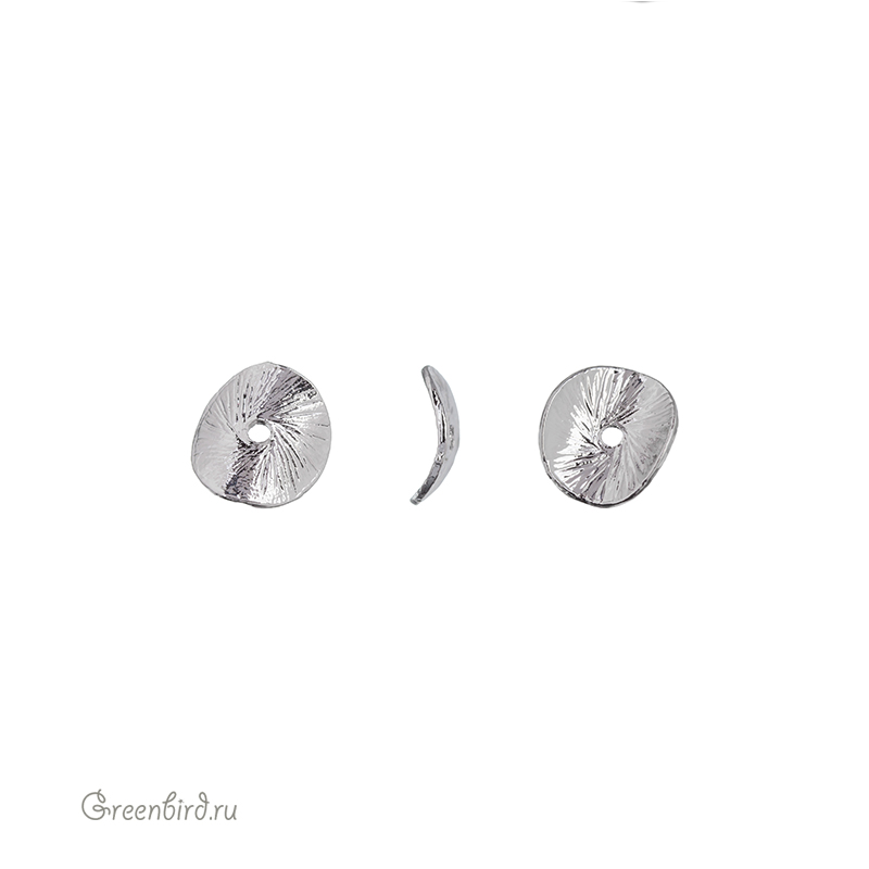 Металлическая бусина с текстурированием, может использоваться в качестве спейсера (разделителя) или чашечки для другой фигурной бусины. Материал: пьютер (оловянный сплав), покрытие: родий. Размер: 9,7 х 8,6 х 2,3 мм, отверстие: 1,3-1,4 мм. Производство: Корея. Цена указана за 1 шт.