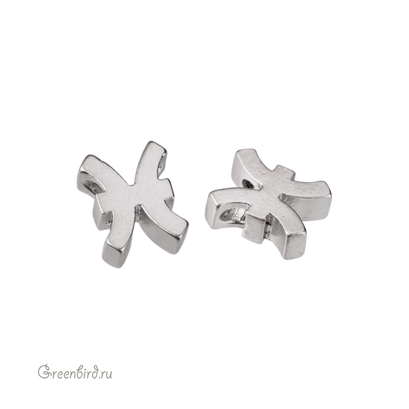 Металлическая бусина в форме зодиакального символа (Рыбы). Материал: латунь, покрытие: матовый родий. Размер: 5,7 х 7,2 мм, толщина: 2,6 мм, отверстие: 1,2 мм. Производство: Корея. Цена указана за 1 шт.