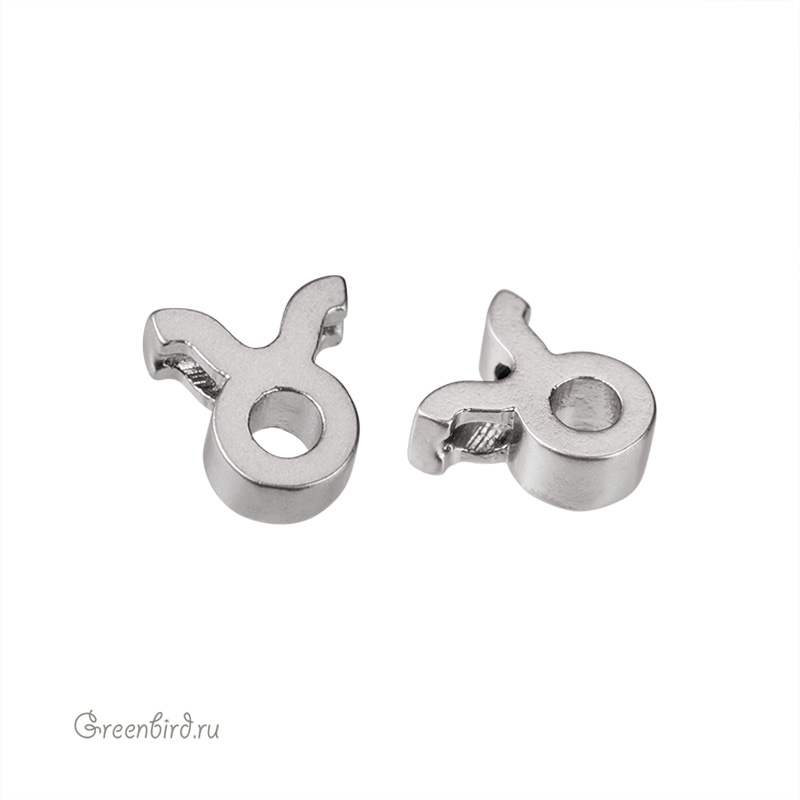 Металлическая бусина в форме зодиакального символа (Телец). Материал: латунь, покрытие: матовый родий. Размер: 6,4 х 7,1 мм, толщина: 2,8 мм, отверстие: 1,2 мм. Производство: Корея. Цена указана за 1 шт.