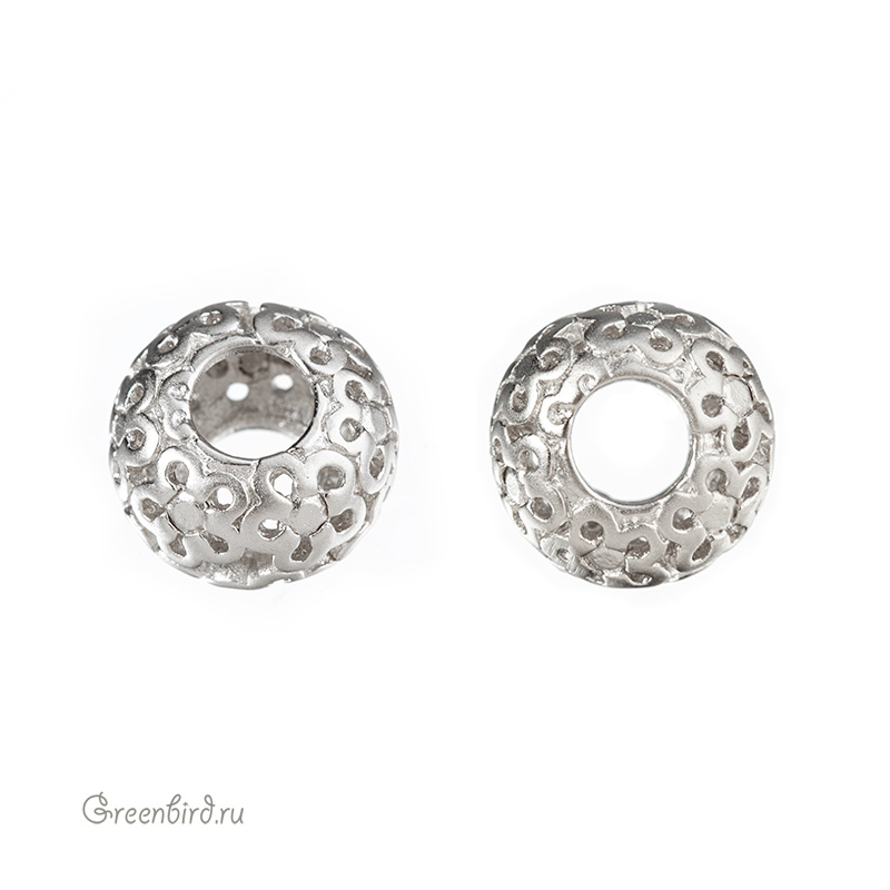 Металлическая бусина-шарм ажурная с цветочным узором. Материал: латунь, покрытие: матовый родий. Размер: 11,7 х 7,7 мм, диаметр отверстия: 4,9 мм. Производство: Корея. Цена указана за 1 шт.
