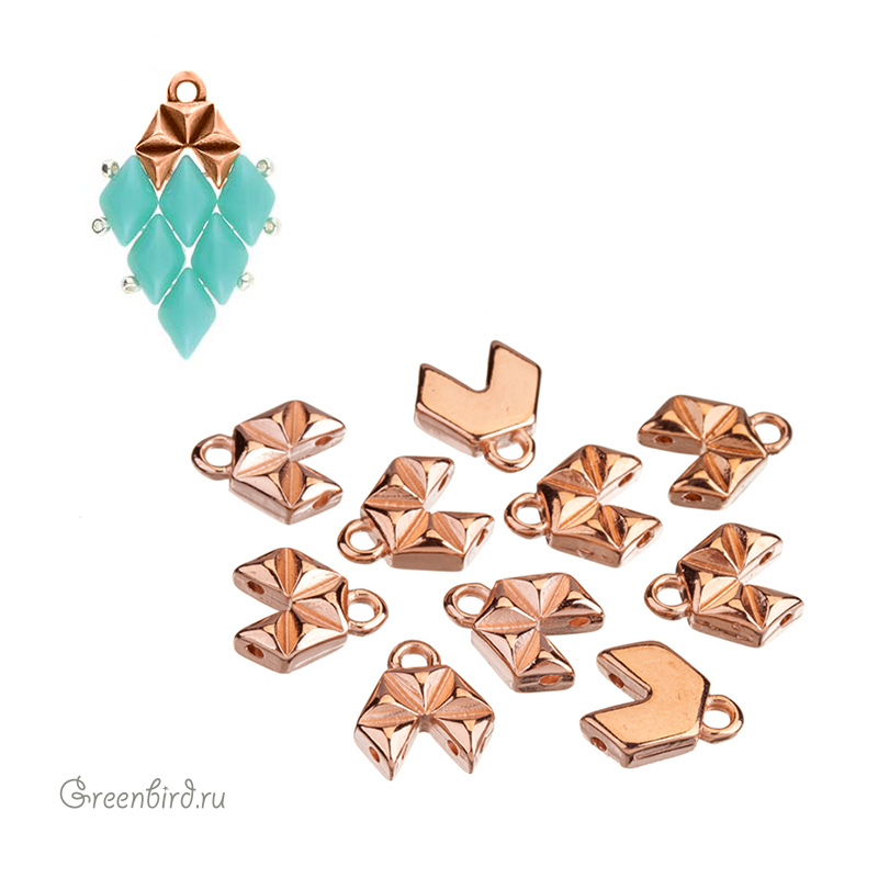 Металлический концевик CYMBAL "Voudia" для работы с бусинами GemDuo. Размер с колечком: 10,6 х 9,3 мм, отверстия для крепления: 0,8 мм, колечко: 1,7 мм. Материал: латунь, покрытие: розовое золото. Производство: Греция. Цена указана за 1 шт.