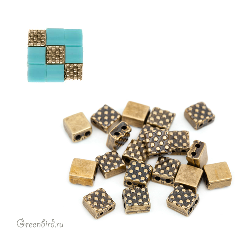 Металлическая бусина Tila CYMBAL "Parasporos" с текстурированной лицевой стороной и гладкой оборотной. Размер: 4,8 х 4,8 х 2,8 мм, отверстия примерно 0,8 мм. Материал: латунь, покрытие: античная латунь. Производство: Греция. Цена указана за 1 шт.