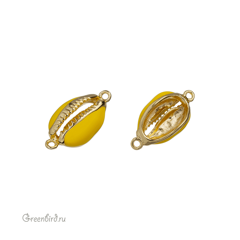 Фурнитура для бижутерии - коннектор односторонний в форме ракушки каури с эмалью. Материал: латунь, покрытие: золото. Цвет эмали: желтый. Размер: 22,3 х 11,1 х 7,8 мм, внутренний размер примерно 7,3 х 13 мм, колечки: 1,4 мм. Размеры могут незначительно отличаться. Производство: Китай. Цена указана за 1 шт.