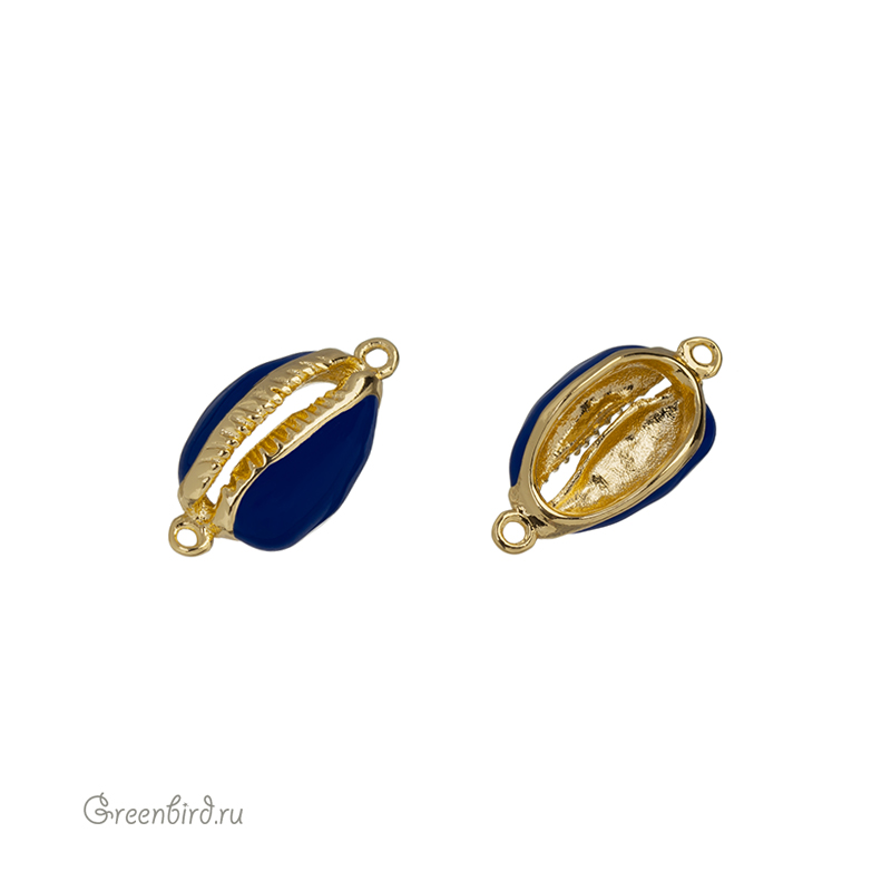 Фурнитура для бижутерии - коннектор односторонний в форме ракушки каури с эмалью. Материал: латунь, покрытие: золото. Цвет эмали: темно-синий (королевский синий). Размер: 22,3 х 11,1 х 7,8 мм, внутренний размер примерно 7,3 х 13 мм, колечки: 1,4 мм. Размеры могут незначительно отличаться. Производство: Китай. Цена указана за 1 шт.