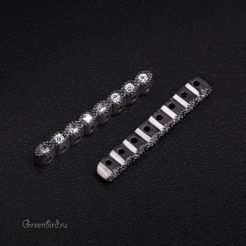 Фурнитура для бижутерии - коннектор с фианитами узкий. На боковых сторонах расположены отверстия для протягивания тонкого шнура (0,5-0,6 мм) и для лески/нити. Материал: латунь, покрытие: gunmetal (оружейная сталь), темный. Размер: 2,3 х 22,2 х 3 мм, диаметр отверстий: 0,7 мм. Количество отверстий: 8 штук. Производство: Китай. Цена указана за 1 шт.