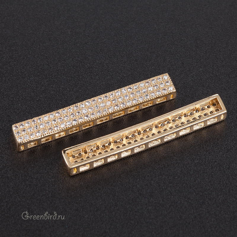 Фурнитура для бижутерии - коннектор с фианитами большой. На боковых сторонах расположены отверстия для протягивания ленты или шнура и два узких отверстия для лески или нити. Материал: латунь, покрытие: золото. Размер: 5,2 х 38 х 4 мм, размер отверстий: 2 х 2 и 1,5 х 0,3 мм (по краям коннектора). Количество отверстий: 12 штук. Производство: Китай. Цена указана за 1 шт.