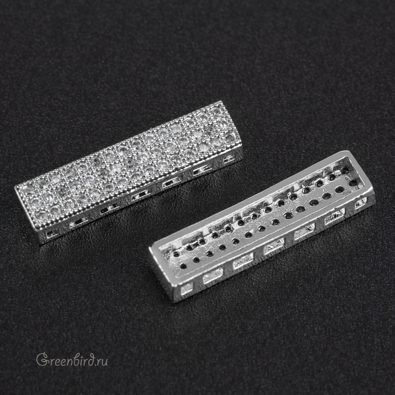 Фурнитура для бижутерии - коннектор с фианитами. На боковых сторонах расположены отверстия для протягивания ленты или шнура. Материал: латунь, покрытие: родий. Размер: 5,4 х 22 х 3,9 мм, размер отверстий: 2 х 1,4 и 1,1 х 1,4 мм (по краям коннектора). Количество отверстий: 7 штук. Производство: Китай. Цена указана за 1 шт.