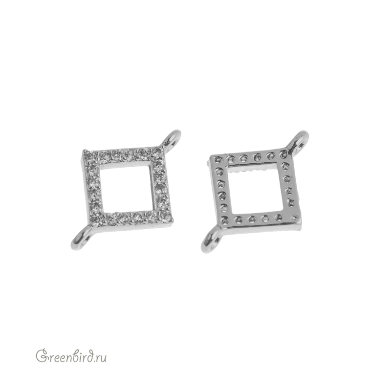 Фурнитура для бижутерии - коннектор в форме равностороннего ромба, с одной стороны украшенный фианитами (кристальное паве). Материал: латунь, покрытие: родий. Размер с колечками: 12,3 х 8,8 мм, внутренний размер отверстия: 5 х 5 мм, колечки: 0,9 мм. Производство: Китай. Цена указана за 1 шт.