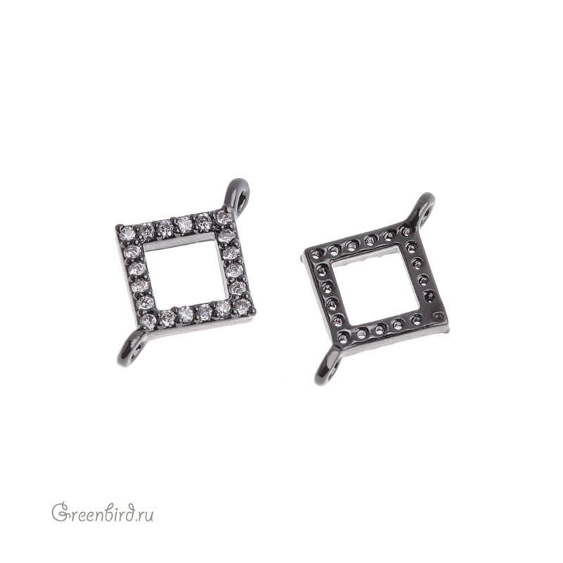 Фурнитура для бижутерии - коннектор в форме равностороннего ромба, с одной стороны украшенный фианитами (кристальное паве). Материал: латунь, покрытие: gunmetal (оружейная сталь). Размер с колечками: 12,3 х 8,8 мм, внутренний размер отверстия: 5 х 5 мм, колечки: 0,9 мм. Производство: Китай. Цена указана за 1 шт.