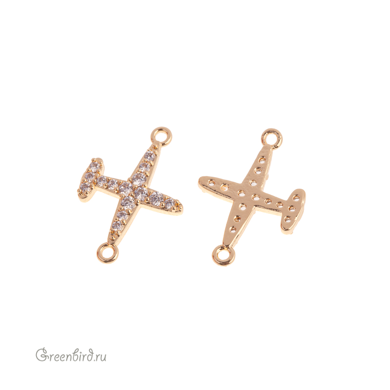Фурнитура для бижутерии - коннектор в форме самолета, с одной стороны украшенный фианитами (кристальное паве), с фронтально ориентированными колечками. Материал: латунь, покрытие: золото. Размер с колечками: 17,6 х 12,1 мм, колечки: 1 мм. Производство: Китай. Цена указана за 1 шт.