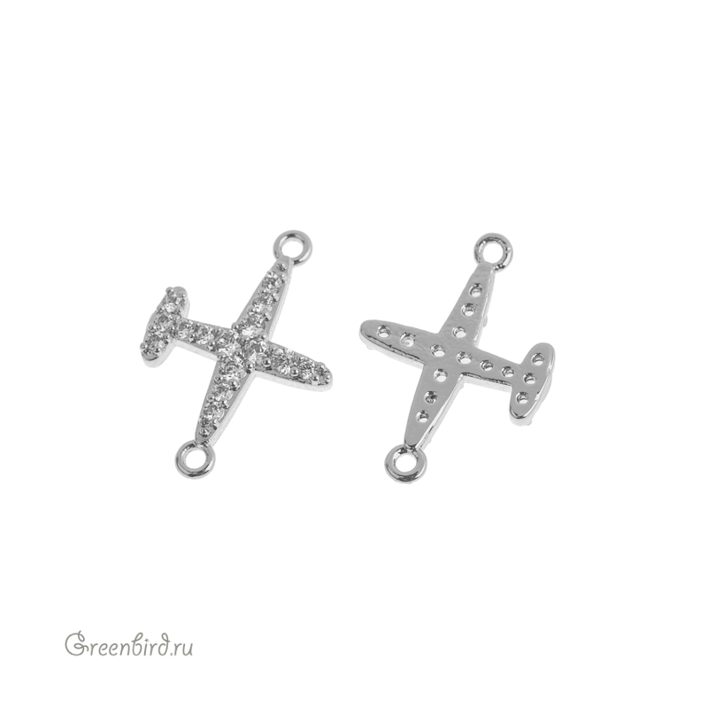 Фурнитура для бижутерии - коннектор в форме самолета, с одной стороны украшенный фианитами (кристальное паве), с фронтально ориентированными колечками. Материал: латунь, покрытие: родий. Размер с колечками: 17,6 х 12,1 мм, колечки: 1 мм. Производство: Китай. Цена указана за 1 шт.