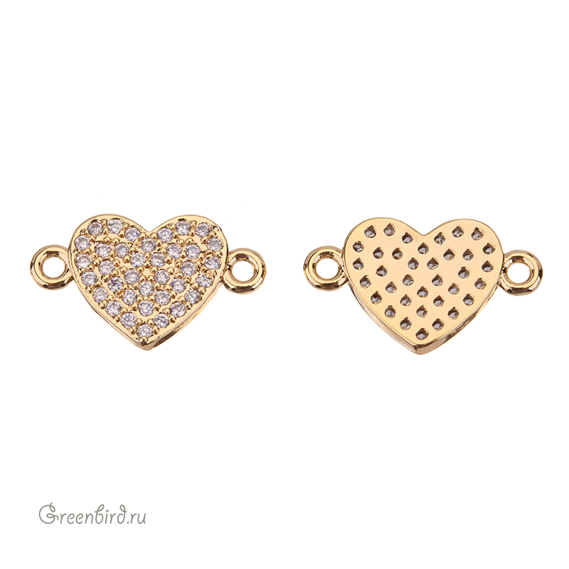 Фурнитура для бижутерии - коннектор в форме сердца, с одной стороны украшенный фианитами (кристальное паве). Материал: латунь, покрытие: золото. Размер с колечками: 15,5 х 9 мм, внутренний размер колечек: 1,2 мм. Производство: Китай. Цена указана за 1 шт.