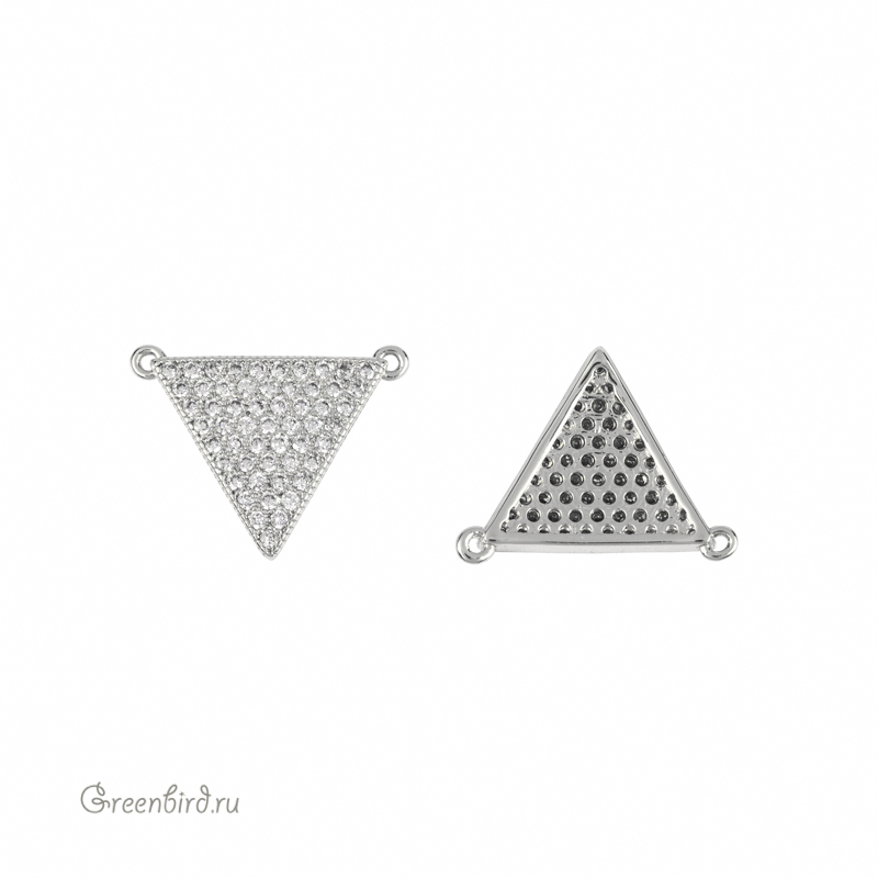 Фурнитура для бижутерии - коннектор-подвеска в форме треугольника, украшенный фианитами, с фронтально ориентированными колечками, расположенными на углах одной грани. Материал: латунь, покрытие: родий. Размер с колечками: 18 х 14,1 мм, внутренний диаметр колечка: 0,6-0,7 мм. Производство: Китай. Цена указана за 1 шт.