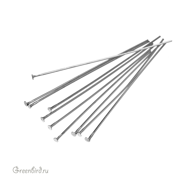 Фурнитура для бижутерии - пины со шляпкой. Материал: латунь, покрытие: родий. Длина: 50 мм, толщина: 0,7 мм, диаметр шляпки: 2 мм. Производство: Китай. Цена указана за 10 шт.