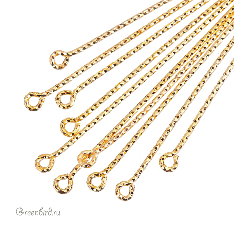 Фурнитура для бижутерии - фактурные декоративные пины с колечком. Материал: латунь, покрытие: золото. Длина: 40 мм, толщина: 0,8 мм, внутренний диаметр колечка: 1,3 мм. Производство: Китай. Цена указана за 10 шт.