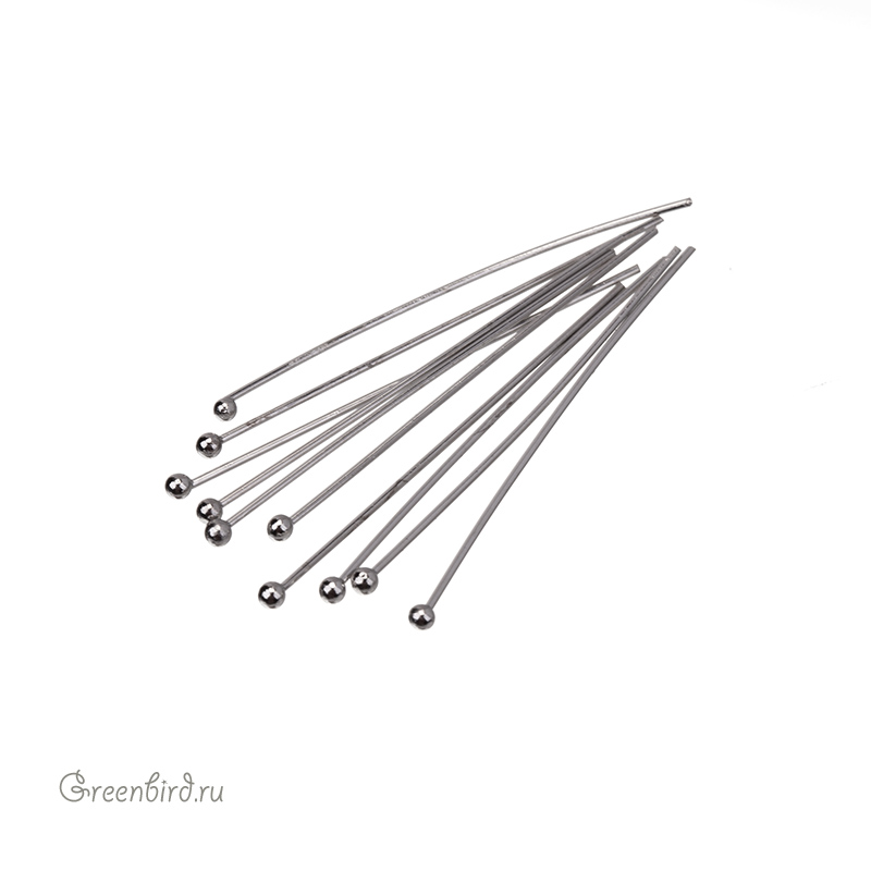 Фурнитура для бижутерии - пины с шариком. Материал: латунь, покрытие: родий. Длина: 35 мм, толщина: 0,6 мм, диаметр шарика: 2 мм. Производство: Китай. Цена указана за 10 шт.