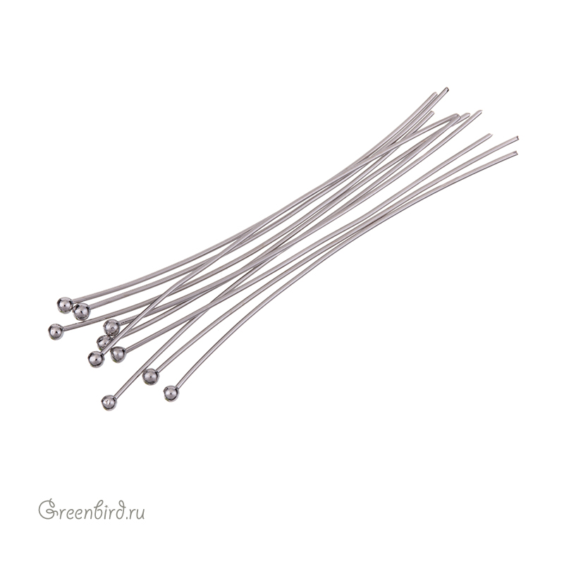 Фурнитура для бижутерии - пины с шариком. Материал: латунь, покрытие: родий. Длина: 50 мм, толщина: 0,6 мм, диаметр шарика: 2 мм. Производство: Китай. Цена указана за 10 шт.