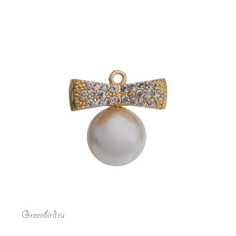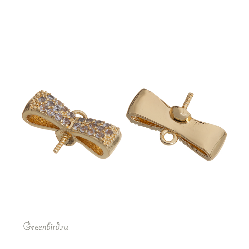 Фурнитура для бижутерии - подвеска в форме бантика, с одной стороны украшенного фианитами, с витым штырьком для вклеивания. Материал: латунь, покрытие: золото. Размер декоративного элемента с петелькой: 13,2 х 6 мм, длина штырька: 2,7 мм, толщина штырька: 0,8 мм. Производство: Китай. Цена указана за 1 шт.