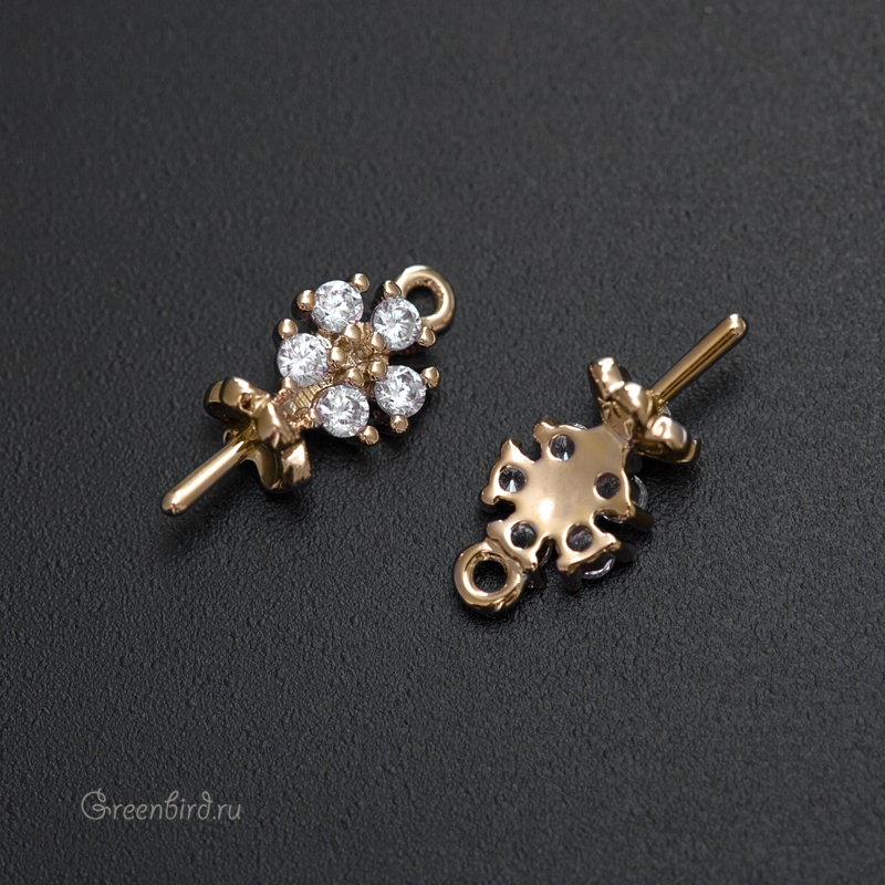 Фурнитура для бижутерии - подвеска с цветком, украшенным фианитами, с гладким штырьком для вклеивания. Материал: латунь, покрытие: светлое золото. Размер декоративного элемента с петелькой: 5,9 х 9,5 мм, внутренний диаметр шапочки: 3,2 мм, длина штырька: 3,8 мм, толщина штырька: 0,9 мм. Производство: Китай. Цена указана за 1 шт.