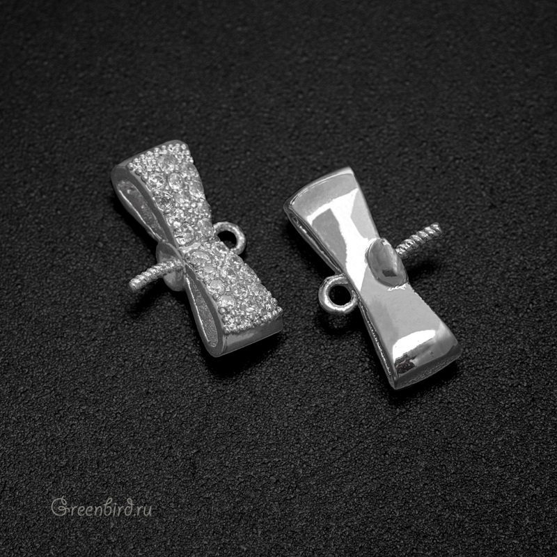 Фурнитура для бижутерии - подвеска в форме бантика, с одной стороны украшенного фианитами, с витым штырьком для вклеивания. Материал: латунь, покрытие: родий. Размер декоративного элемента с петелькой: 13,2 х 6 мм, длина штырька: 2,7 мм, толщина штырька: 0,8 мм. Производство: Китай. Цена указана за 1 шт.