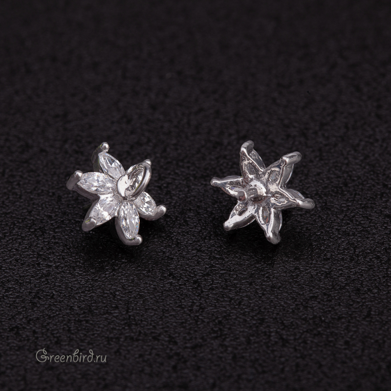 Фурнитура для бижутерии - подвеска-шапочка в форме цветка, украшенного фианитами, с гладким штырьком для вклеивания. Материал: латунь, покрытие: родий. Форма огранки фианитов: маркиз. Размер декоративного элемента с петелькой: 6,9 х 5,6 мм, длина штырька: 2,8 мм, толщина штырька: 0,9 мм. Производство: Китай. Цена указана за 1 шт.