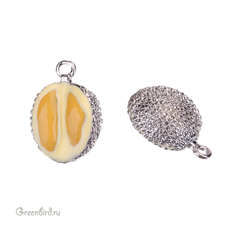 Фурнитура для бижутерии - подвеска в форме дуриана с эмалью. Материал: латунь, покрытие: родий. Цвет: желтый, оранжевый. Размер с колечком: 16 х 11,5 х 8 мм, внутренний размер колечка: 1,5 мм. Производство: Китай. Цена указана за 1 шт.
