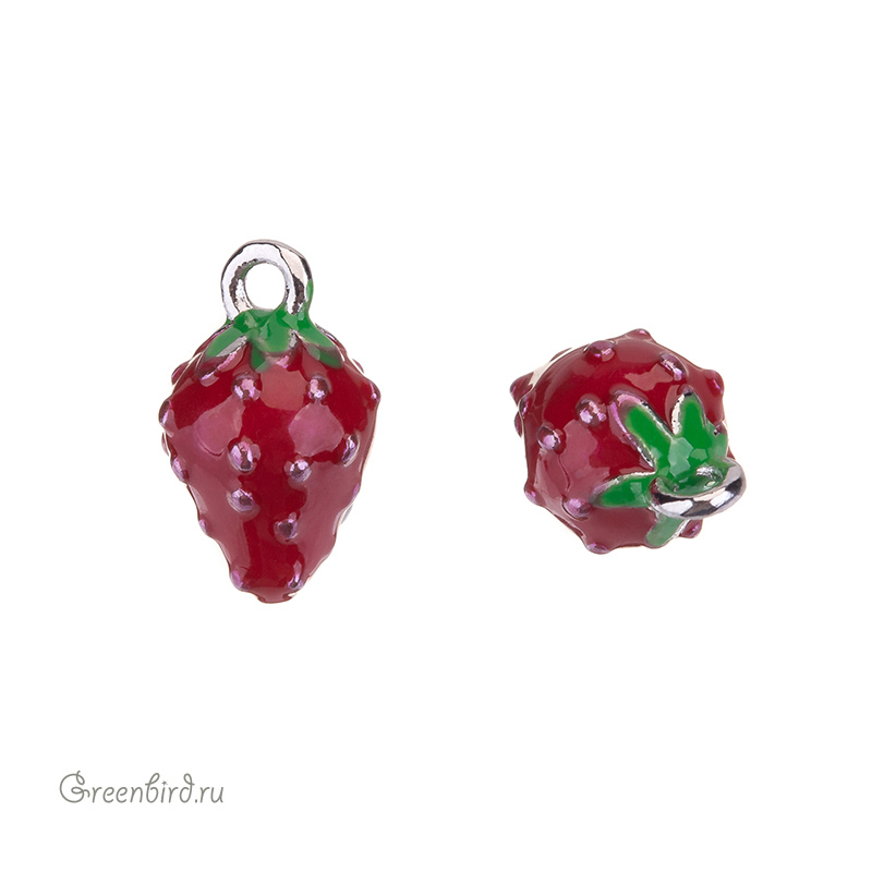 Фурнитура для бижутерии - подвеска в форме земляники с эмалью. Материал: латунь, покрытие: родий. Цвет: красный, зеленый. Размер с колечком: 11,5 х 7 мм, внутренний размер колечка: 1,3 мм. Производство: Китай. Цена указана за 1 шт.