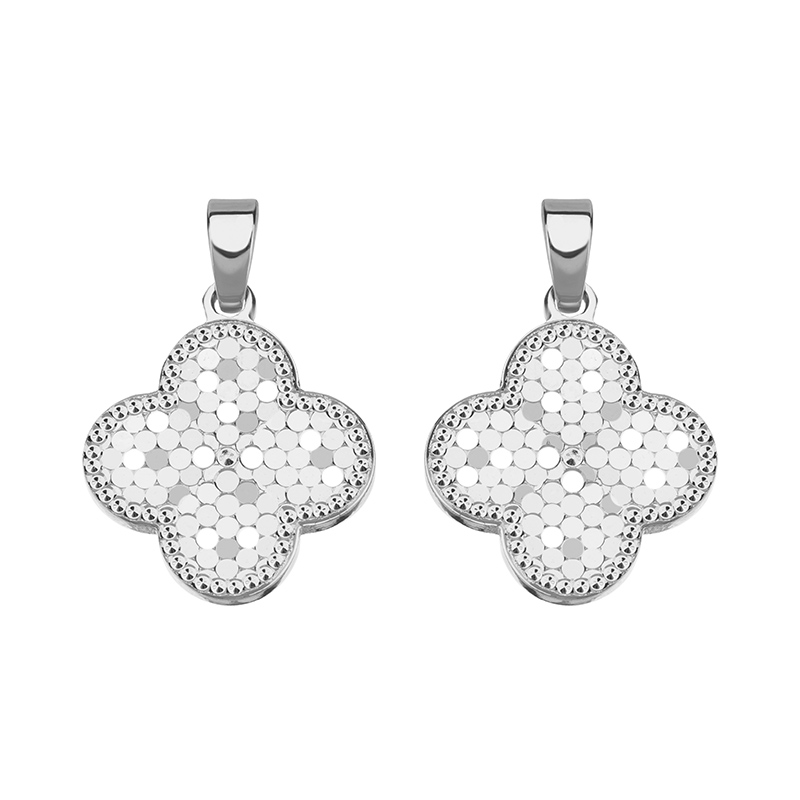 Фурнитура для бижутерии - подвеска с бейлом двусторонняя в форме четырехлистника или клевера, с чеканкой. Материал: латунь, покрытие: родий. Размер с колечком: 14,5 х 16 x 2 мм, диаметр отверстия: примерно 1 мм, размер бейла: 4 x 5,5 мм. Производство: Китай. Цена указана за 1 шт.