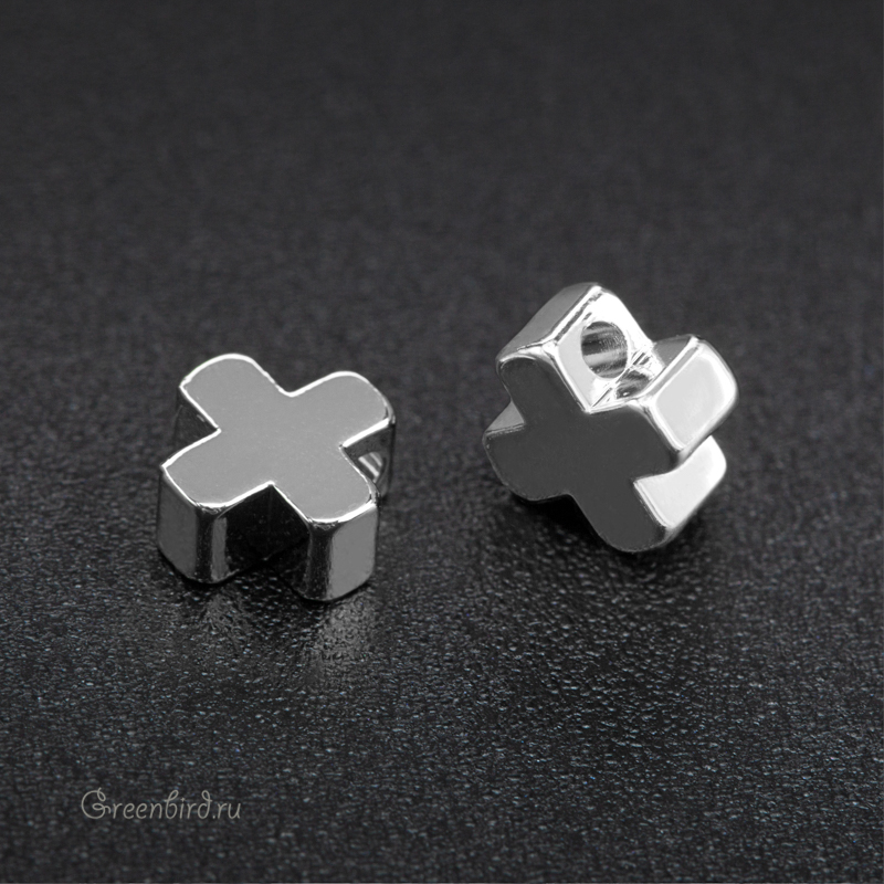 Фурнитура для бижутерии - подвеска в форме объемного плюса (крестика) со сквозным отверстием. Материал: латунь, покрытие: родий. Размер: 6,1 х 6,1 х 2,8 мм, внутренний диаметр отверстия: 1 мм. Производство: Китай. Цена указана за 1 шт.