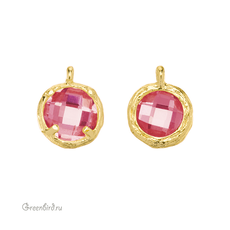 Фурнитура для бижутерии - подвеска круглая с кристаллом. Материал: латунь, покрытие: золото. Цвет вставки: Padparadscha. Размер с колечком: 9,5 х 7,5 х 4 мм, внутренний диаметр колечка: 1,2 мм. Производство: Китай. Цена указана за 1 шт.