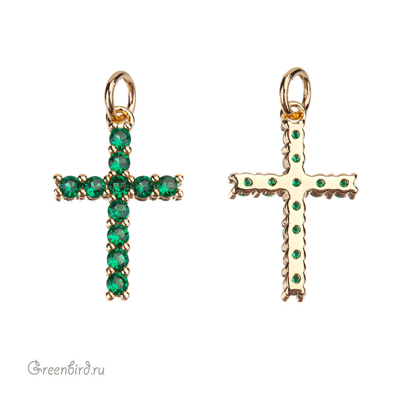 Фурнитура для бижутерии - подвеска в форме крестика с фианитами. Материал: латунь, покрытие: золото. Цвет вставки: зеленый. Размер с колечком: 22 х 12,3 х 2,7 мм, внутренний диаметр колечка: 3,3 мм. Производство: Китай. Цена указана за 1 шт.
