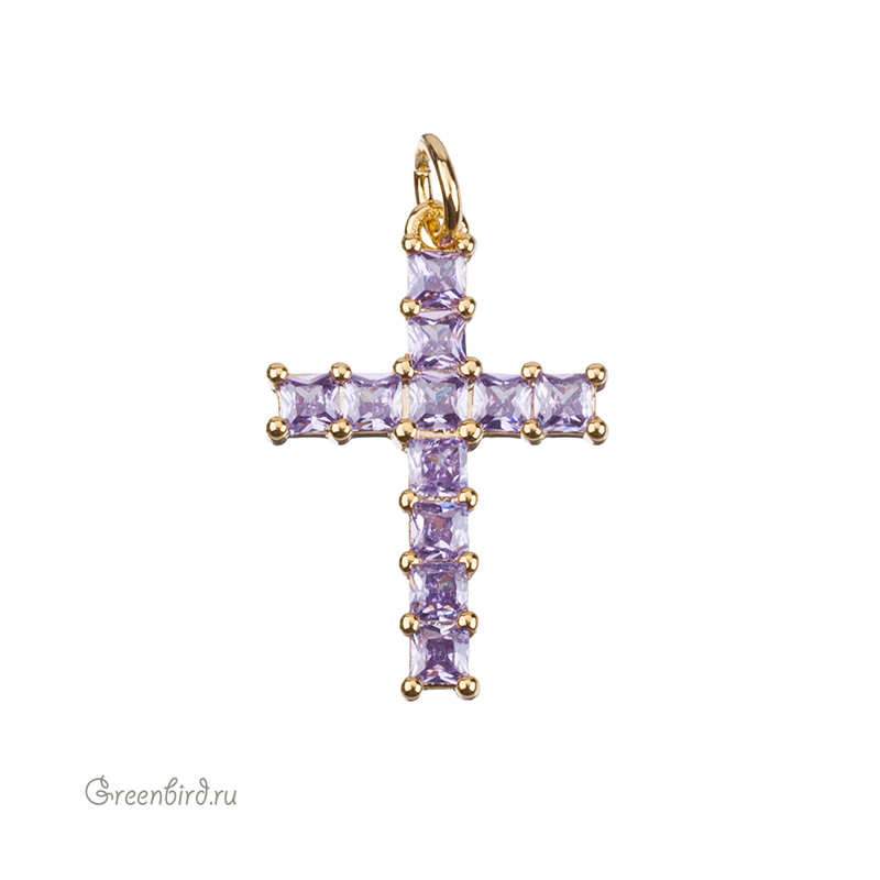 Фурнитура для бижутерии - подвеска в форме крестика с кристаллами. Материал: латунь, покрытие: золото. Цвет вставки: фиолетовый. Размер с колечком: 25 х 15 х 2 мм, внутренний диаметр колечка: 3,3 мм. Производство: Китай. Цена указана за 1 шт.