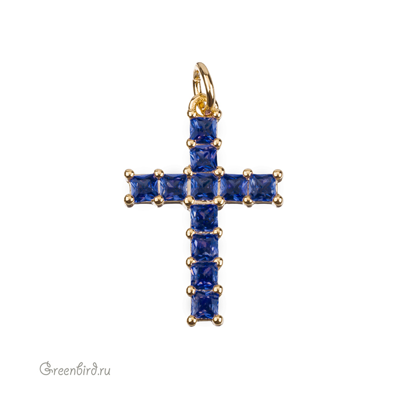 Фурнитура для бижутерии - подвеска в форме крестика с кристаллами. Материал: латунь, покрытие: золото. Цвет вставки: синий. Размер с колечком: 25 х 15 х 2 мм, внутренний диаметр колечка: 3,3 мм. Производство: Китай. Цена указана за 1 шт.