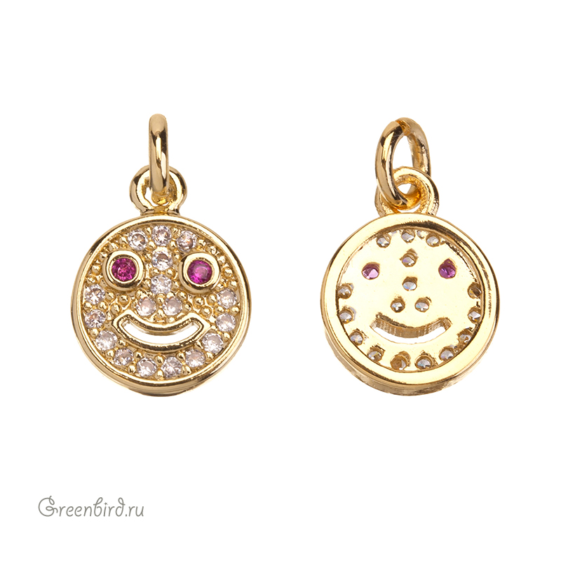 Фурнитура для бижутерии - подвеска в форме смайлика, украшенная фианитами. Материал: латунь, покрытие: золото. Размер с колечком: 13 х 8 мм, внутренний диаметр колечка: 2,4 мм. Производство: Китай. Цена указана за 1 шт.