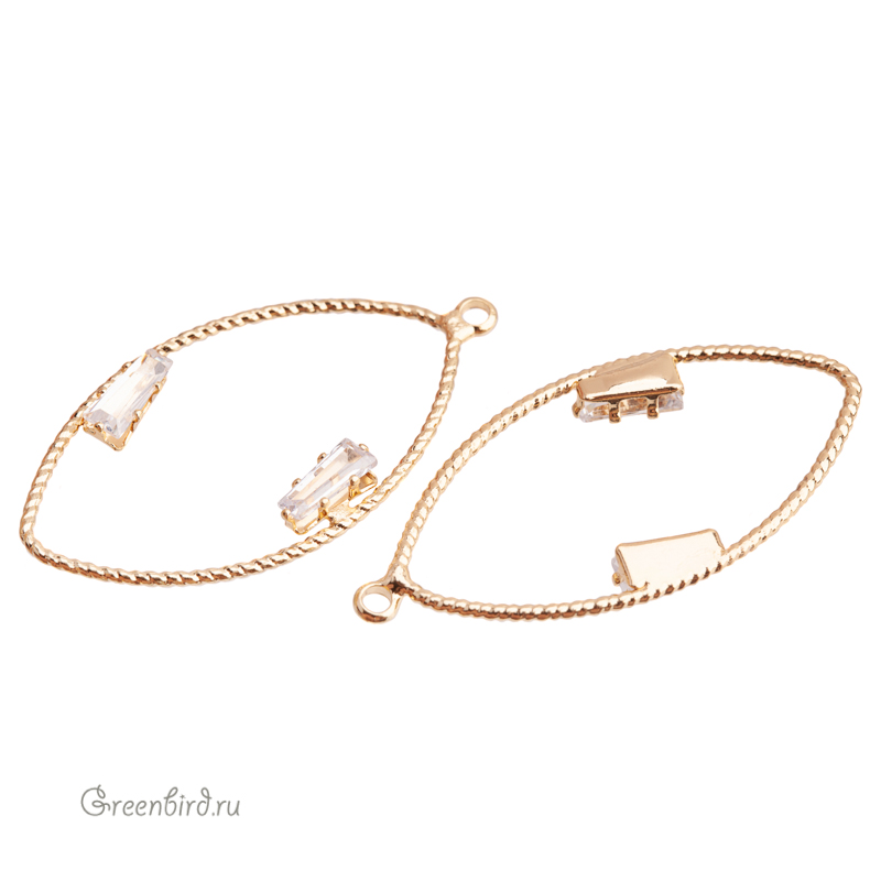 Фурнитура для бижутерии - подвеска-коннектор миндалевидной формы с фианитами. Форма огранки фианитов: трапеция. Материал: латунь, покрытие: золото. Размер с колечком: 17,8 х 38 мм, внутренний размер: 32,7 х 14,4 мм, фианиты: 7 х 3 мм, колечко: 1,9 мм. Производство: Китай. Цена указана за 1 шт.