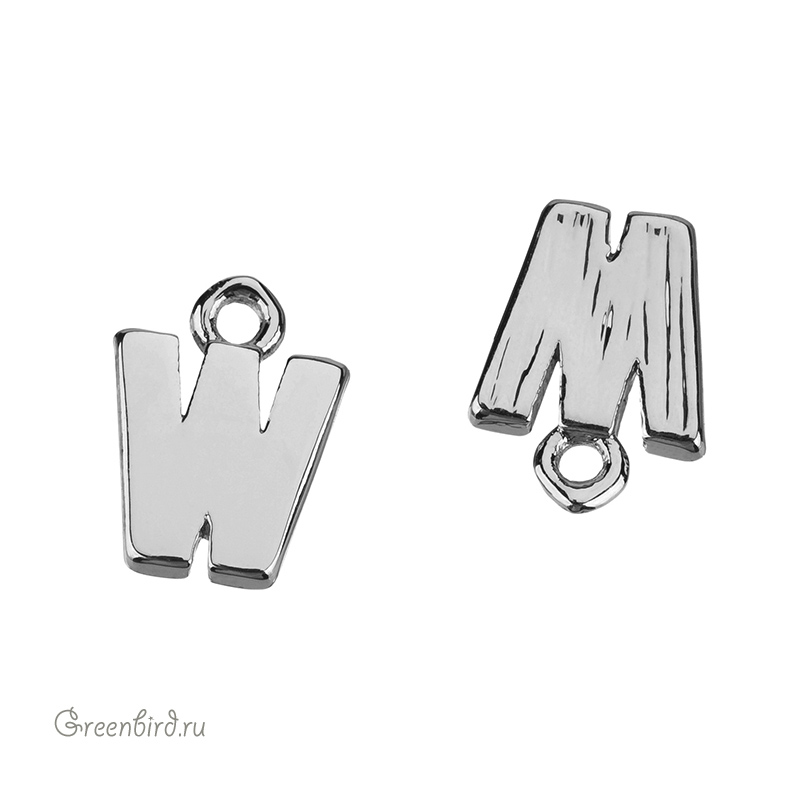 Фурнитура для бижутерии - подвеска в форме буквы «W», гладкая с лицевой стороны и фактурная с другой. Материал: латунь, покрытие: родий. Размер с колечком: 8 х 5,8 мм, толщина: 1,3 мм, внутренний диаметр колечка: 0,7 мм. Производство: Китай. Цена указана за 1 шт.