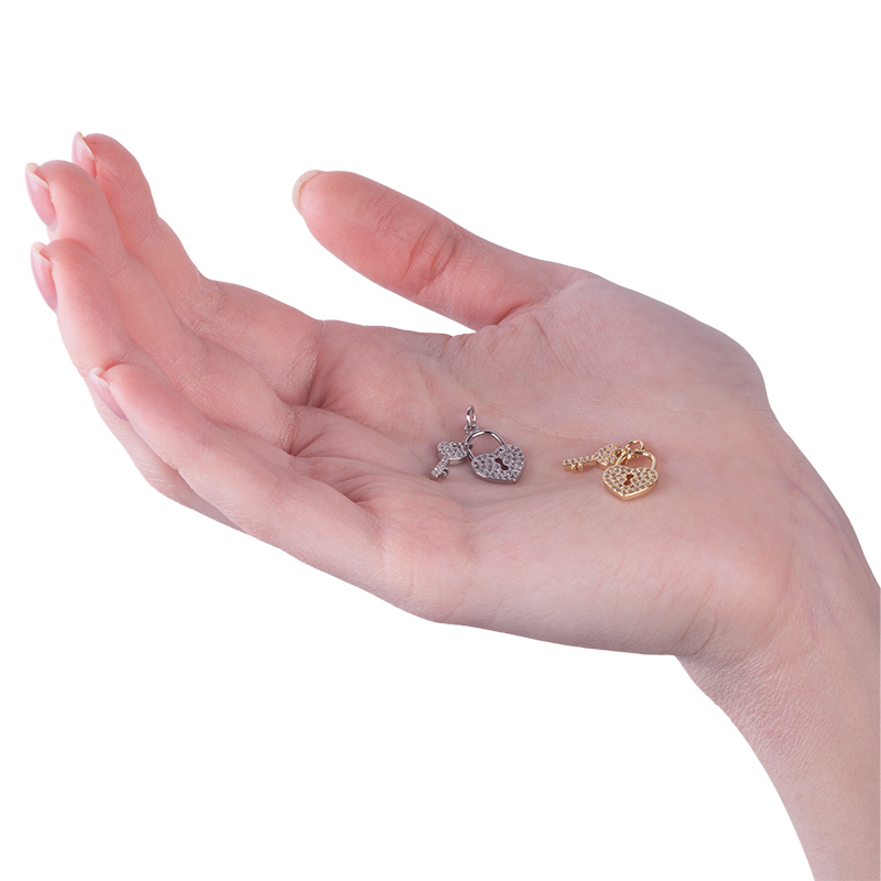Фурнитура для бижутерии - подвеска в форме замочка-сердца и ключа, инкрустированых фианитами. Материал: латунь, покрытие: золото. Цвет вставки: белый. Размер замочка с колечком: 18 х 10 х 2 мм, размер ключика: 14 х 6 х 2 мм, внутренний диаметр колечка: 3,5 мм. Производство: Китай. Цена указана за 1 шт.