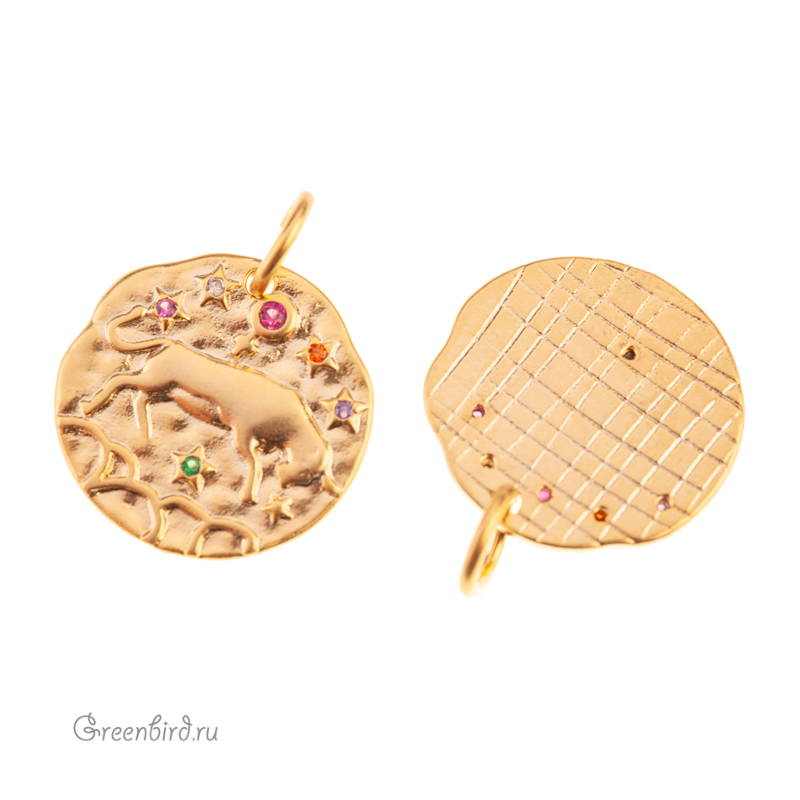 Фурнитура для бижутерии - подвеска односторонняя с зодиакальным символом, украшенная фианитами, с разъемным кольцом. Материал: латунь, покрытие: золото. Цвета фианитов: сиреневый, розовый, оранжевый, зеленый. Размер: 15 х 14,8 мм, толщина: 1,7 мм, кольцо: 5,8 мм, толщина проволоки: 0,9 мм, общая высота: 18,6 мм. Обратите внимание: в зависимости от партии покрытие может быть глянцевым или более матовым. Возможны наплывы покрытия на фианиты. Производство: Китай. Цена указана за 1 шт.
